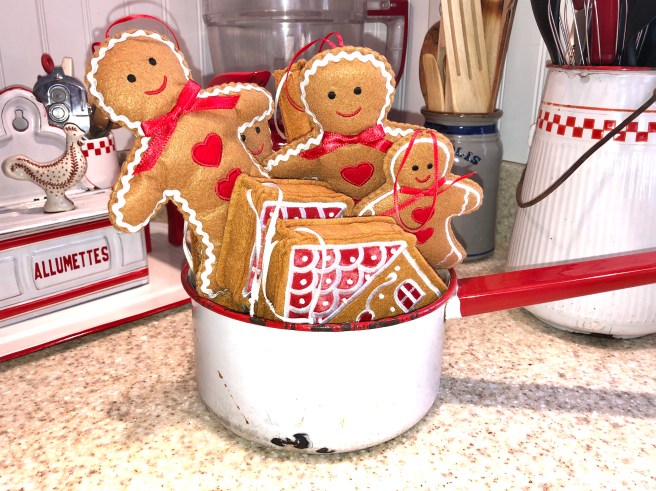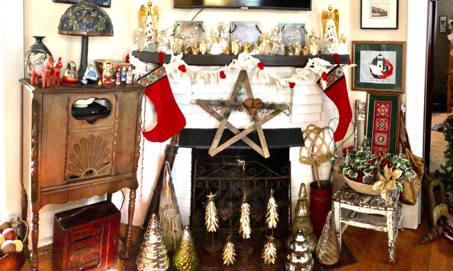 In between the busy, when the house is quiet and the day is almost over, I like to sit and just enjoy our lovely home dressed up in Christmas fineness. Sometimes it’s the simple touches that grab my heart, evergreen tucked into a vintage milk bottle or cute little gingerbread men peeking from am enamelware pot. Sometimes a little glitz makes me smile, gold capiz shell angels and shiny mercury glass trees sparkling in the firelight. Aesthetically confusing, perhaps, but it makes happy. I hope it makes you happy as well!