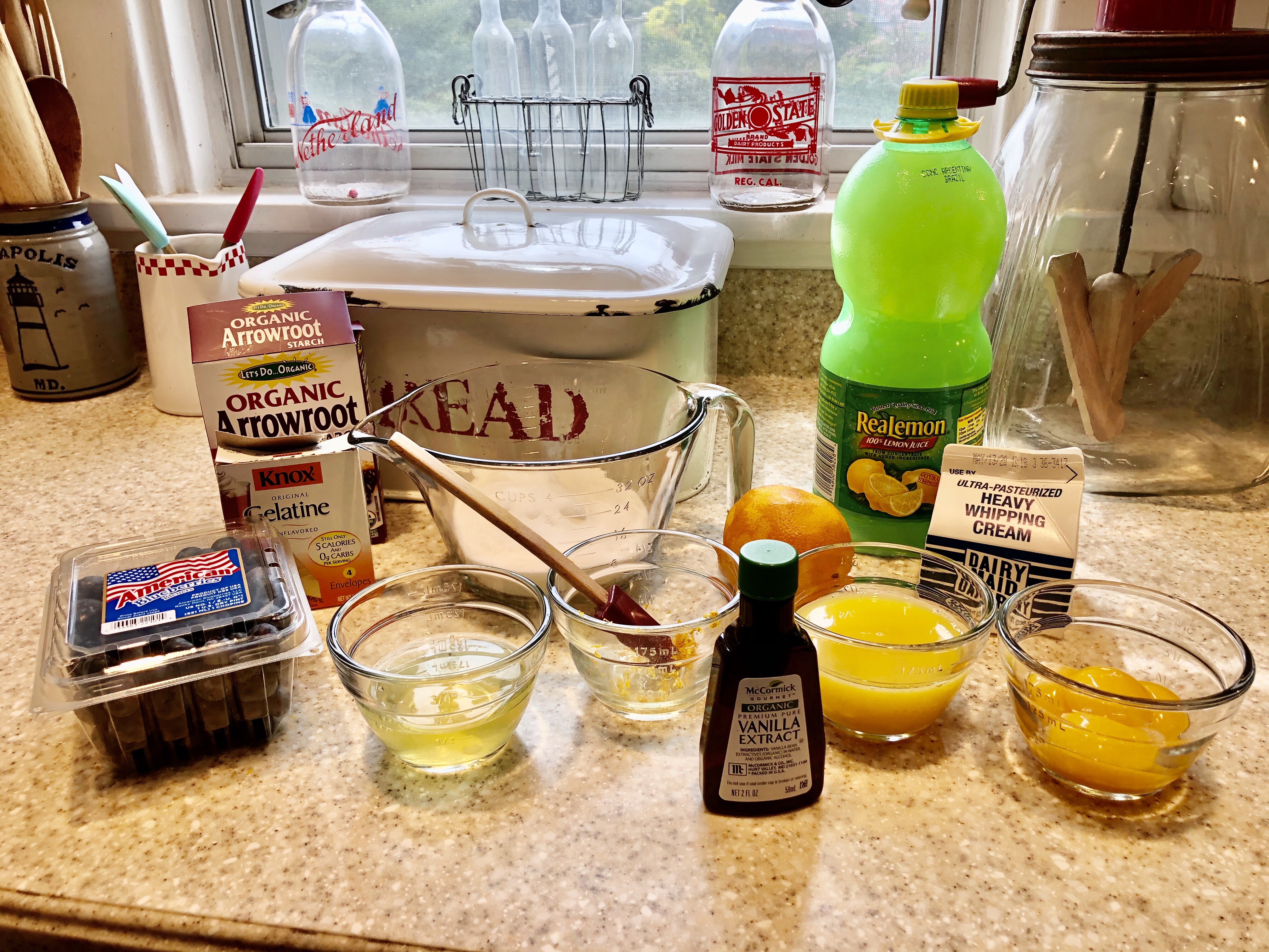 4. In a metal mixing bowl, combine zests, lemon juice, remaining sugar, egg yolks, and remaining salt. Place bowl over a large pan of simmering water. DO NOT LET THE BOWL TOUCH THE WATER, and cook 4-5 minutes stirring consistently until it forms a soft custard. Remove from heat and add gelatin and vanilla. Stir to dissolve.